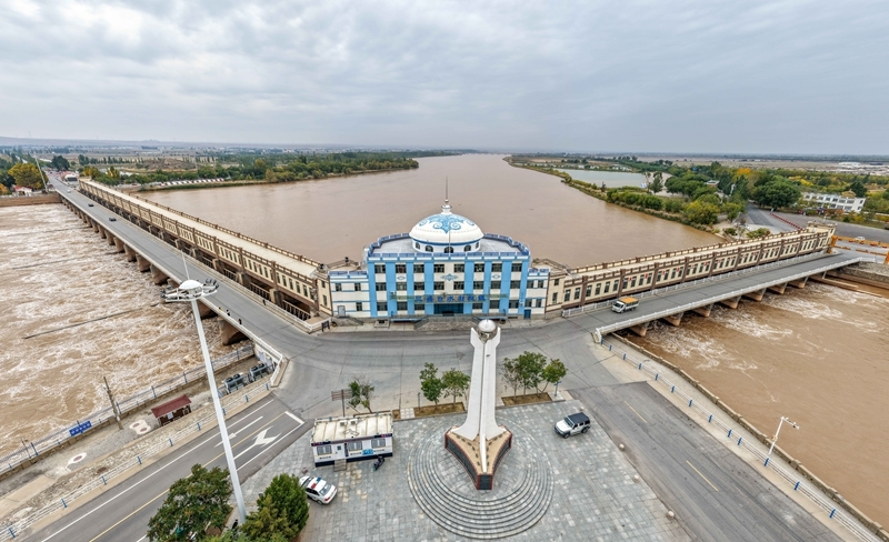 这是10月16日在内蒙古巴彦淖尔市磴口县拍摄的开闸放水的三盛公水利枢纽(无人机照片)。近日,内蒙古巴彦淖尔市的河套灌区启动秋浇工作。秋浇是指河套地区大规模引黄灌溉的一项农事活动,旨...