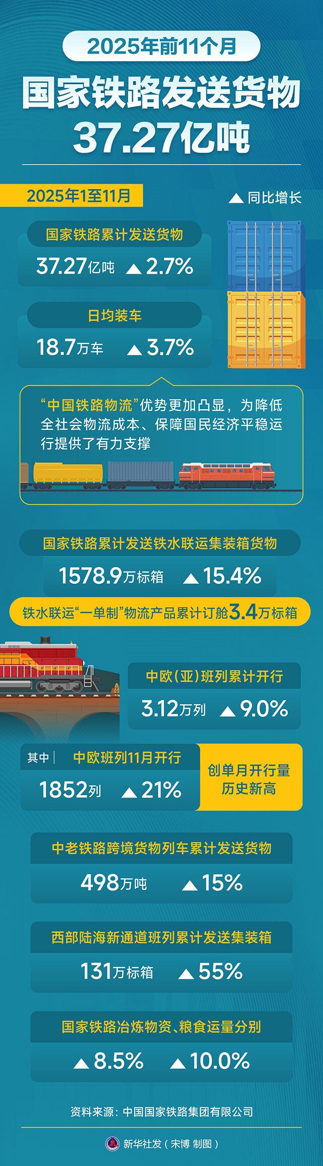 记者12月19日从中国国家铁路集团有限公司获悉,今年1至11月,国家铁路累计发送货物37.27亿吨,同比增长2.7%;日均装车18.7万车,同比增长3.7%,“中国铁路物流”优势更...